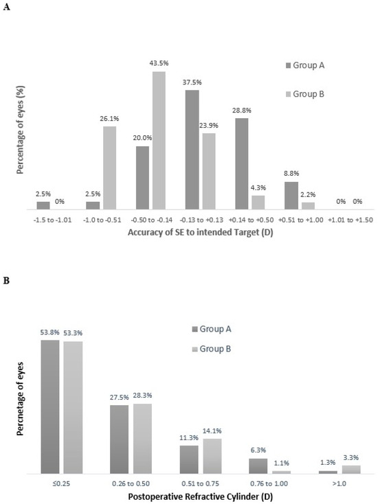 Refractive outcomes of all studied eyes. (A) accuracy to the intended spherical equivalent refraction postoperatively for all studied eyes, (B) postoperative refractive cylinder (SE = spherical equivalent; D = dioptres).