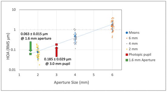 Data from the HOAs obtained from 6-, 4-, and 2-mm apertures were fit individually with non-linear regressions to estimate the HOAs that could be expected with the pinhole IOL with its 1.6 mm effective aperture at the corneal plane after implantation.