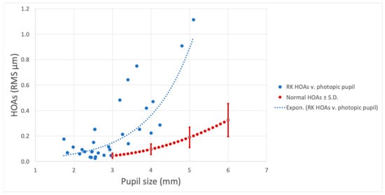 Photopic pupil aberrations in post-RK patients compared to HOAs in normal eyes. The red dotted line indicates average HOAs for normal subjects over the pupil sizes of 3–6 mm [8].