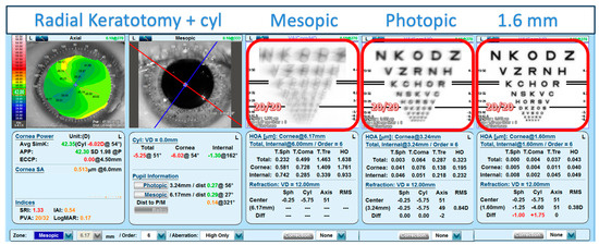 The OPD-Scan III (NIDEK, Inc., Gamagori, Japan) was used in one post-RK patient not from the study cohort to simulate the impact the pinhole IOL could have with the 1.6 mm aperture on CDVA by convolving the HOAs measured from corneal topography with photopic and mesopic pupil sizes and with a 1.6 mm aperture.