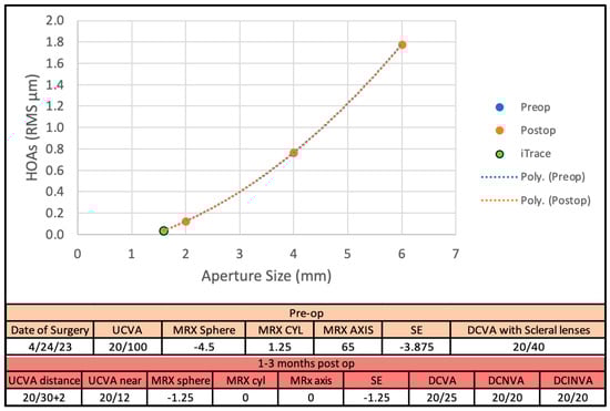 For one post-RK patient who underwent cataract surgery with the implantation of the IC-8® Apthera™, corneal HOAs up to the 6th order and the whole eye HOAs were measured using the Scheimpflug and with ray-tracing (iTrace, Tracey Technologies, Houston, TX, USA) instruments, respectively, both pre-operatively and 1 and 3 months post-operatively.