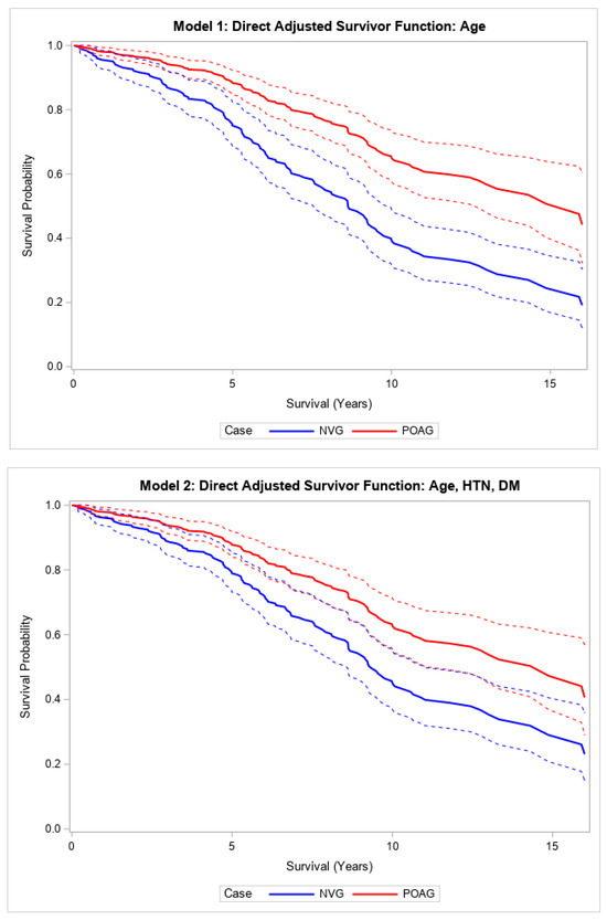 Direct adjusted survival curves demonstrated increased all-cause mortality in patients with NVG compared to those with POAG after glaucoma surgery in the model adjusted for age (top) and the model adjusted for age, hypertension, and diabetes mellitus (bottom). The solid line provides the estimated direct adjusted survival estimate for each group, with the corresponding dashed colored lines representing the 95% confidence bounds.