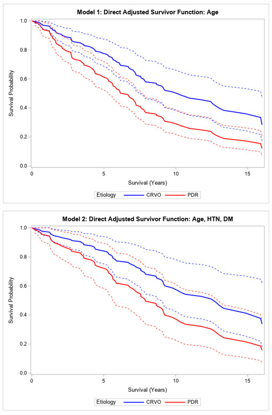 Direct adjusted survival curves demonstrated increased all-cause mortality in patients with NVG secondary to PDR compared to those with NVG secondary to CRVO after glaucoma surgery in the model adjusted for age (top) and the model adjusted for age, hypertension, and diabetes mellitus (bottom). The solid line provides the estimated direct adjusted survival estimate for each group, with the corresponding dashed colored lines representing the 95% confidence bounds. Central retinal vein occlusion (CRVO); proliferative diabetic retinopathy (PDR); hypertension (HTN); diabetes mellitus (DM).
