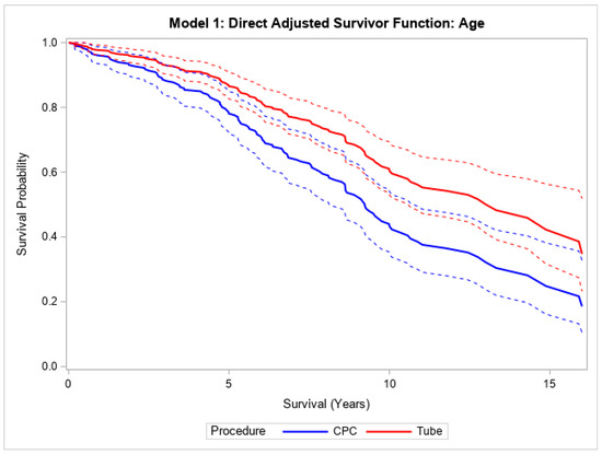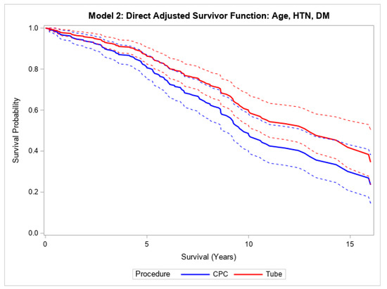 Direct adjusted survival curves demonstrated increased mortality in patients who underwent CPC diode laser surgery compared to patients who underwent tube shunt surgery in the model adjusted for age (top) and the model adjusted for age, hypertension, and diabetes mellitus (bottom). The solid line provides the estimated direct adjusted survival estimate for each group, with the corresponding dashed colored lines representing the 95% confidence bounds. Cyclophotocoagulation diode laser (CPC); hypertension (HTN); diabetes mellitus (DM).