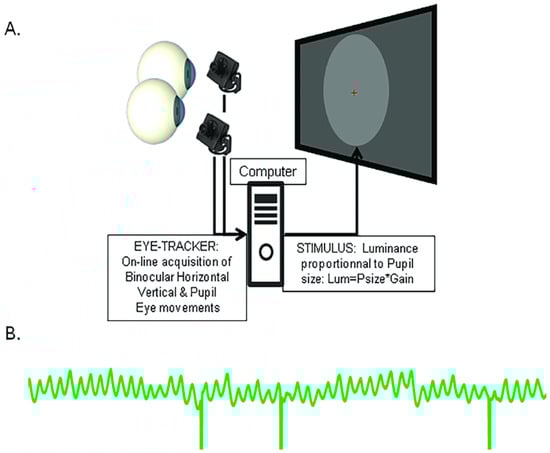 Lamirel and colleagues [30] introduced a novel method that relies on computerised biofeedback, where online recording of pupil size with an eye tracker is used to adjust the luminance of a stimulus displayed on a computer screen in real time (Figure 2). In this setting, the luminance of a stimulus of any colour, size and position is set to be proportional to pupil size, and updated on every frame. With this closed loop coupling, a large pupil results in a high stimulus luminance, which in turn induces a pupil constriction, which in turn results in a lower stimulus luminance, and so on (see Supplementary Video S1). The so induced pupil oscillations that reflect the activation dynamics within the retino-pupillary circuits can be recorded, allowing quantitative off-line analyses to measure the frequency, amplitude and stability of pupil oscillations, as well as fixation eye movements and number of blinks, providing additional data relevant to the characterisation of eye health and potentially distinguishing patients from healthy individuals.