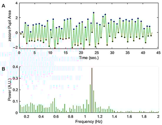 (A) Z-scored pupil oscillations corrected for blinks. A ramp from 0 to 1 and from 1 to 0 was applied to the beginning and end of the trace, respectively, to avoid spurious transients that could distort the spectral power distribution. The discs superimposed on the pupil trace show the maxima and minima of the oscillations (peak and trough times) used to compute the mean period and regularity over time, as well as the oscillation amplitude and variability. (B) Power spectrum between 0.2 and 2 Hz (green lines) of the trace in (A). The maximum power of the spectrum between 0.2 and 2 Hz (red line) was taken as a measure of the power and frequency of the pupil oscillation.