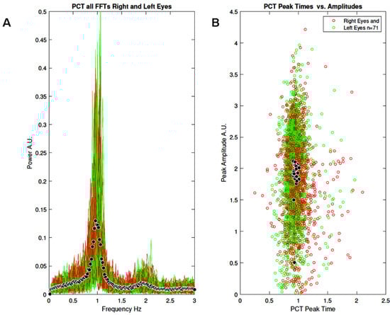 Results of study 1: (A) All FFTs normalised by frequency (power × frequency) for the right (red) and left (green) eyes (N = 71). Black symbols represent the mean FFT. (B) All peak times as a function of peak amplitudes for the right (red) and left (green) eyes (N = 71). Black symbols represent average peak time versus average peak amplitude.