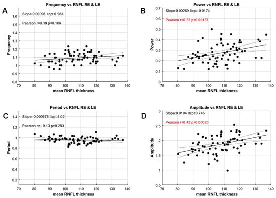 Correlations between the PCT variables and the mean RNFL thickness of both eyes. (A) Oscillation frequency versus mean RNFL. (B) Oscillation power versus mean RNFL. (C) Oscillation period versus mean RNFL. (D) Mean oscillation amplitude versus mean RNFL. Insets indicate the values of a linear fit, together with Pearson’s correlation coefficient, r. Significant values (p < 0.05) are shown in red. Filled and dashed lines show the linear fit to the data and the 95% confidence intervals, respectively.