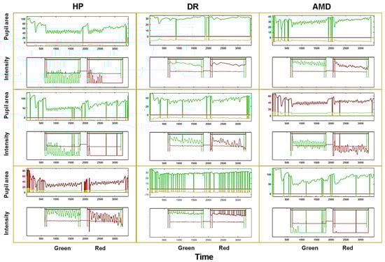 Examples of raw pupil recordings for 3 HP (left column), 3 AMD (middle column) and 3 DR (right column) patients. Each framed graph shows a complete trial, starting with the induction of a PLR, followed by the green stimulus, a 4 s delay, and the red stimulus. The upper trace is the pupil area, the lower trace is the corresponding RGB stimulus intensity modulation. Vertical lines are blinks.