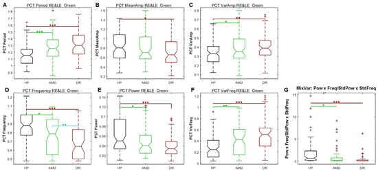 Study 2: Box plots of each PCT characteristics for the green sequence with pooled right and left eyes data. (A) Period. (B) amplitude. (C) Amplitude variability. (D) frequency. (E) Power. (F) Irregularity. (G) MixVar. Black plots: HP; Green plots: AMD; Red plots: DR. The statistical significance of comparisons between groups are shown by stars: * p < 0.05, ** p < 0.01, *** p < 0.001.
