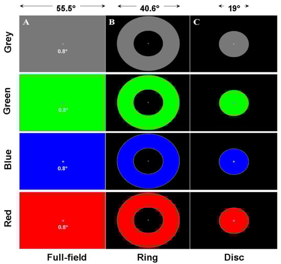 Illustration of the spatial configurations and colours used in Study 3. (A) Full-field stimulus of different colours. (B) Ring stimulus of different colours. (C) Disc stimulus of different colours.
