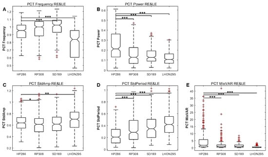 Study 3. Box plots of each population (HP, RP, SD, LHON) of PCT characteristics with data from the pooled right and left eyes. (A) Frequency. (B) Power. (C) Amplitude variability. (D) Regularity. (E) MixVar, equal to F × P/StdA × StdP. The statistical significance of comparisons between HP and patients are shown by stars: * p < 0.05, ** p < 0.01, *** p < 0.001.