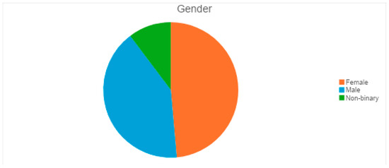 There was a total of 107 respondents to the survey. The majority were aged 25–34 (19.6%), followed by 18–24 (17.8%), 35–44 (15.0%), 45–54 (15.9%), 55–64 (15.9%), and 65 and older (15.9%). This balanced distribution helps to analyze eye health awareness across different age groups (Figure 1). The gender distribution shows 52 females, 44 males, and 11 non-binary participants (Figure 2). The near-equal split between males and females ensures diverse perspectives on eye health issues. Including non-binary respondents allows for a comprehensive understanding of demographic differences in healthcare access.