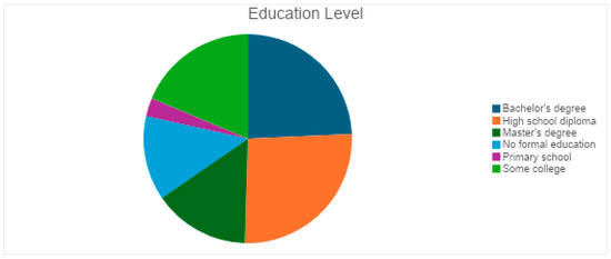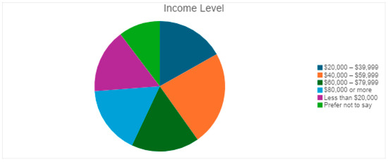 The respondents had a balanced distribution of residence type, which helps assess geographic disparities in eye health accessibility, highlighting whether urban, suburban, or rural populations face greater challenges in seeking medical attention for vision-related issues (Figure 3). Participants had varying educational backgrounds: 26 held a bachelor’s degree, 28 had a high school diploma, 16 had a master’s degree, 20 attended some college, 14 had no formal education, and 3 had primary school education (Figure 4). The financial background of respondents varied, with 25 earning $40,000–$59,999, followed by 18 each in the $20,000–$39,999, $60,000–$79,999, and $80,000 or more ranges. Seventeen earned less than $20,000, and 11 preferred not to disclose their income (Figure 5).