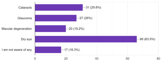 Similarly, the survey further indicated that although dry eye was the most acknowledged eye complaint, there seems to be little awareness of more severe conditions such as cataracts, glaucoma, and macular degeneration (Figure 9). It is not uncommon for people to lack knowledge about more severe, often painless, forms of eye diseases and instead seek attention when they notice more systemic or painful problems [20]. This indicates the potential for health educational campaigns and workshops on the commonly known diseases and the necessity of regular eye checkups that can minimize the worsening of vision impairment due to these diseases.