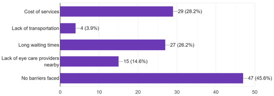 Several respondents (29) believe that cost is a barrier to eye care for them; others are disadvantaged because of the distance to eye care services or lack thereof (Figure 15). Such challenges are well depicted in the literature, where issues of transportation have long been identified as problematic, especially by patients in low-income or remote areas [25]. It is therefore useful to work with local health centers, relevant governmental and non-governmental health facilities, and other relevant NGOs to help address health access barriers. Increased accessibility options for service delivery include mobile clinics, telehealth, or affordable care options.