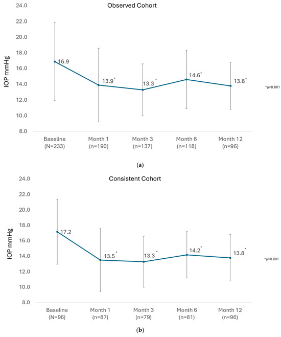 The mean IOP of all eyes available at each visit until Month 12 in the observed cohort is presented in Figure 1a. There was a significant reduction in the mean IOP from 16.9 ± 5.0 mmHg preoperatively to between 13.3 ± 3.3 and 14.6 ± 3.7 mmHg at study visits from 1 month through 12 months (p = 0.001 at every post-operative visit to Month 12). In the consistent cohort of eyes with 12-month data (n = 96), the mean IOP was significantly reduced from 17.2 ± 4.2 mmHg preoperatively to 13.8 ± 3.0 mmHg at Month 12 (p = 0.001), as shown in Figure 1b.