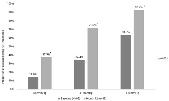 In the observed cohort, the proportion of eyes achieving the prespecified target IOP cutoffs of ≤18 mmHg, ≤15 mmHg, and ≤12 mmHg increased from 66.4%, 40.9%, and 20.3% preoperatively to 92.7%, 71.9%, and 37.5%, respectively at Month 12, (all p = 0.001). Similarly, the proportion of eyes in the consistent cohort achieving the prespecified target IOP cutoffs of ≤18 mmHg, ≤15 mmHg, and ≤12 mmHg increased from 63.5%, 34.4%, and 14.6% preoperatively to 92.7%, 71.9%, and 37.5%, respectively, at Month 12, (all p = 0.001), as shown in Figure 2.