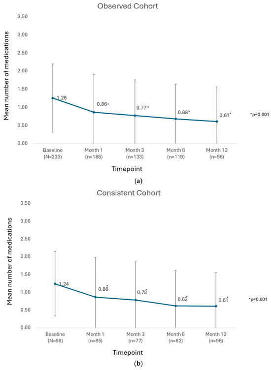 (a) Mean number of medications used by the observed cohort at each visit through 12 months. Footnotes: p-value for paired t-test. (b) Mean number of medications used by the consistent cohort at each visit through 12 months. Footnotes: p-value for paired t-test.