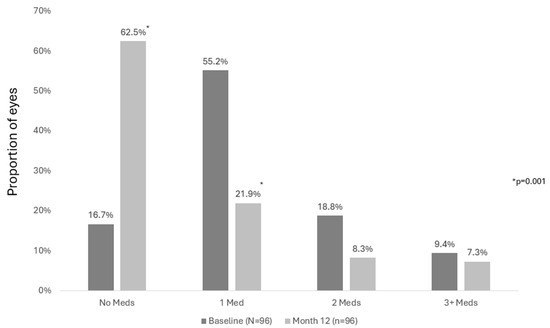 For eyes in the observed cohort, the proportion of eyes that required no medications increased from 16.3% preoperatively to 62.5% (p = 0.001) postoperatively, and the proportion requiring one medication decreased from 55.8% to 21.9% (p = 0.001). The proportions of eyes on 2 or ≥3 medications reduced from 17.2% to 8.3% (p = 0.059) and 10.7% to 7.3% (p = 0.452), respectively. Results were similar in the consistent cohort at 12 months vs. preoperatively, as shown in Figure 4. In the consistent cohort, the proportion of eyes that required no medications increased from 16.7% preoperatively to 62.5% (p = 0.001) postoperatively, and the proportion requiring one medication decreased from 55.2% to 21.9% (p = 0.001). The proportions of eyes on 2 or ≥3 medications reduced from 18.8% to 8.3% (p = 0.058) and from 9.4% to 7.3% (p = 0.794), respectively. At Month 12 compared to preoperatively, 50.0% of eyes had fewer topical medications, 46.9% maintained their medications, and 3.1% increased their medications.