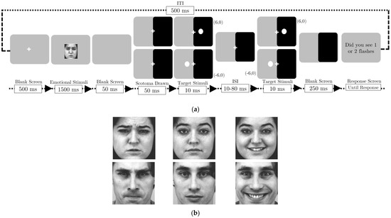 Panel (a) schematic illustration of Experiment. The trial sequence was identical to Experiment 1, with the addition of a preceding emotional prime. Following the initial fixation, an emotional face was presented centrally for 1500 ms, followed by a 50 ms blank screen. The dark overlay was then presented on the right hemifield for 50 ms, after which the two-flash fusion task commenced as described in Figure 1. Panel (b) illustrates the imagery employed in this study for the experiment [55].