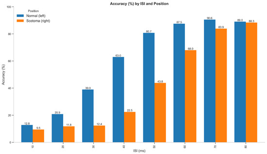Table 1 presents the accuracy rates by ISI and position for Experiment 1. Figure 3 shows the plot bar, and Figure 4 presents the psychometric function of this experiment. The data shows that at the shortest ISI (10 ms), accuracy was low in both conditions (normal: 12.8%, scotoma: 9.5%), suggesting that the flashes were too rapid to be distinguished regardless of position. At intermediate ISIs, the difference became substantial, with the most significant disparity occurring at 40 ms (normal: 63.0%, scotoma: 22.5%) and 50 ms (normal: 80.7%, scotoma: 43.8%). As ISI increased to 80 ms, the performance gap narrowed considerably (normal: 89.0%, scotoma: 88.3%), indicating that with sufficient temporal separation, performance in the scotoma condition approached normal vision.