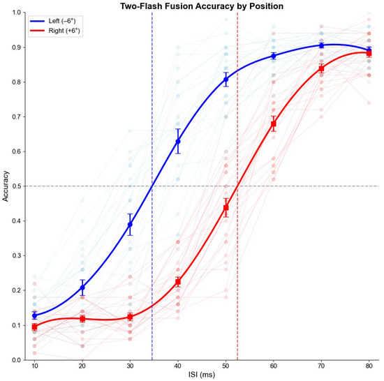 Psychometric functions for two-flash fusion accuracy as a function of interstimulus interval (ISI) in Experiment 1. Accuracy is plotted separately for the normal vision condition (Left, −6°, blue) and the degraded vision condition (Right, +6°, red). Individual participant data are shown as faint lines, and group means with standard errors are shown as filled symbols with error bars. Solid curves represent fitted psychometric functions. Dashed horizontal line indicates the 50% accuracy threshold, and vertical dashed lines mark the group-level thresholds for each condition (Normal ≈ 35 ms; Scotoma ≈ 52 ms). The results show impaired temporal resolution in the scotoma condition, reflected in a rightward shift of the psychometric function.