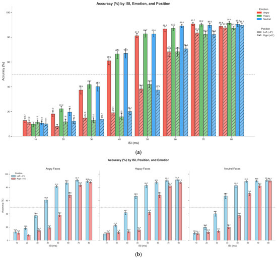 Panel (a) shows accuracy (%) in the two-flash fusion task as a function of interstimulus interval (ISI), separated by both emotion (angry, happy, neutral) and position (normal vision, −6°, solid bars; degraded vision, +6°, hatched bars). Group means with standard errors are displayed for each condition, with numerical values above bars indicating accuracy percentages. Across emotions. Panel (b) shows accuracy (%) in the two-flash fusion task across interstimulus intervals (ISIs), separated by position (normal vision, −6°, blue; degraded vision, +6°, red) and emotional prime (angry, happy, neutral). Each subplot illustrates one emotional condition, with mean accuracy and standard errors displayed for each ISI.