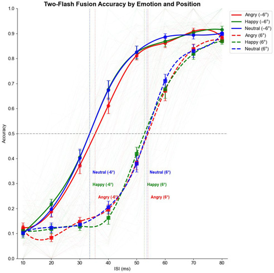 Psychometric functions for two-flash fusion accuracy as a function of interstimulus interval (ISI) in Experiment 2, plotted separately by emotion (angry, happy, neutral) and position (normal vision, −6°, solid lines; degraded vision, +6°, dashed lines). Individual participant data are shown as faint lines, while group means with standard errors are displayed as symbols with error bars. Vertical dotted lines indicate group-level thresholds for each condition. Accuracy increased with ISI across all conditions, and although performance was consistently impaired in the degraded (scotoma) hemifield relative to the normal hemifield, emotional primes (angry, happy, neutral) did not systematically shift thresholds or modulate accuracy.