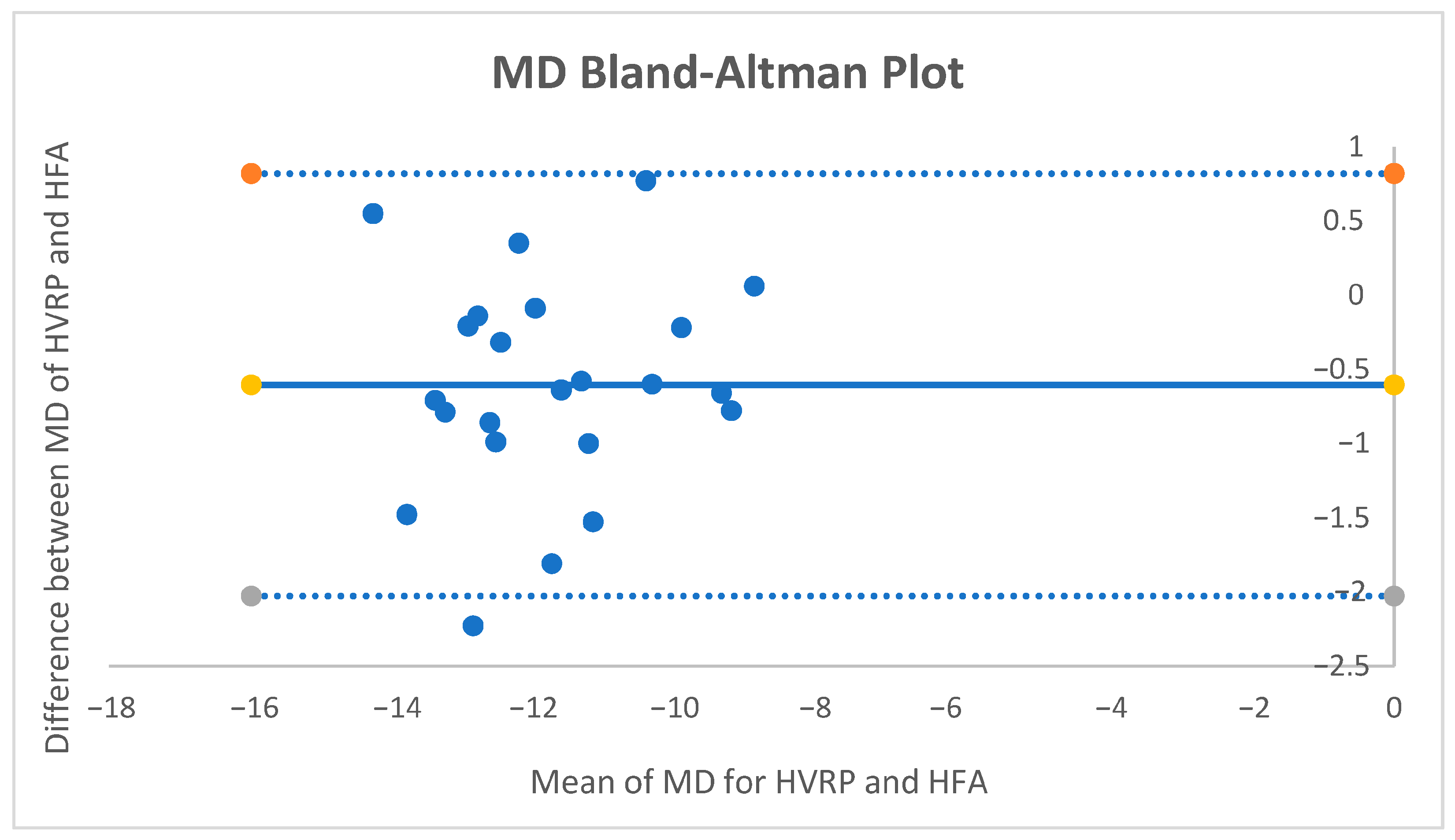 For MD, the mean paired difference (HFA − HVRP) was −0.60 dB (95% CI −0.914 to −0.286;
