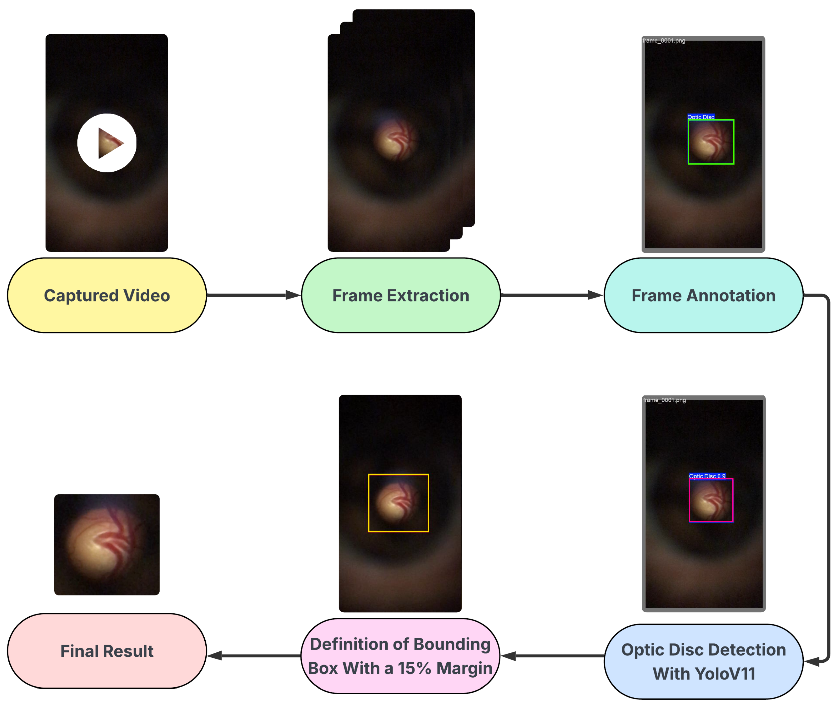 The frames were initially selected by automatically extracting frames at regular intervals throughout the videos, which had an average duration of 15 s, followed by manual validation to ensure the quality and clear presence of the optic disc. The annotation of the optical disc region was performed manually and subsequently validated by a medical expert, who attested to the accuracy of the annotations made.