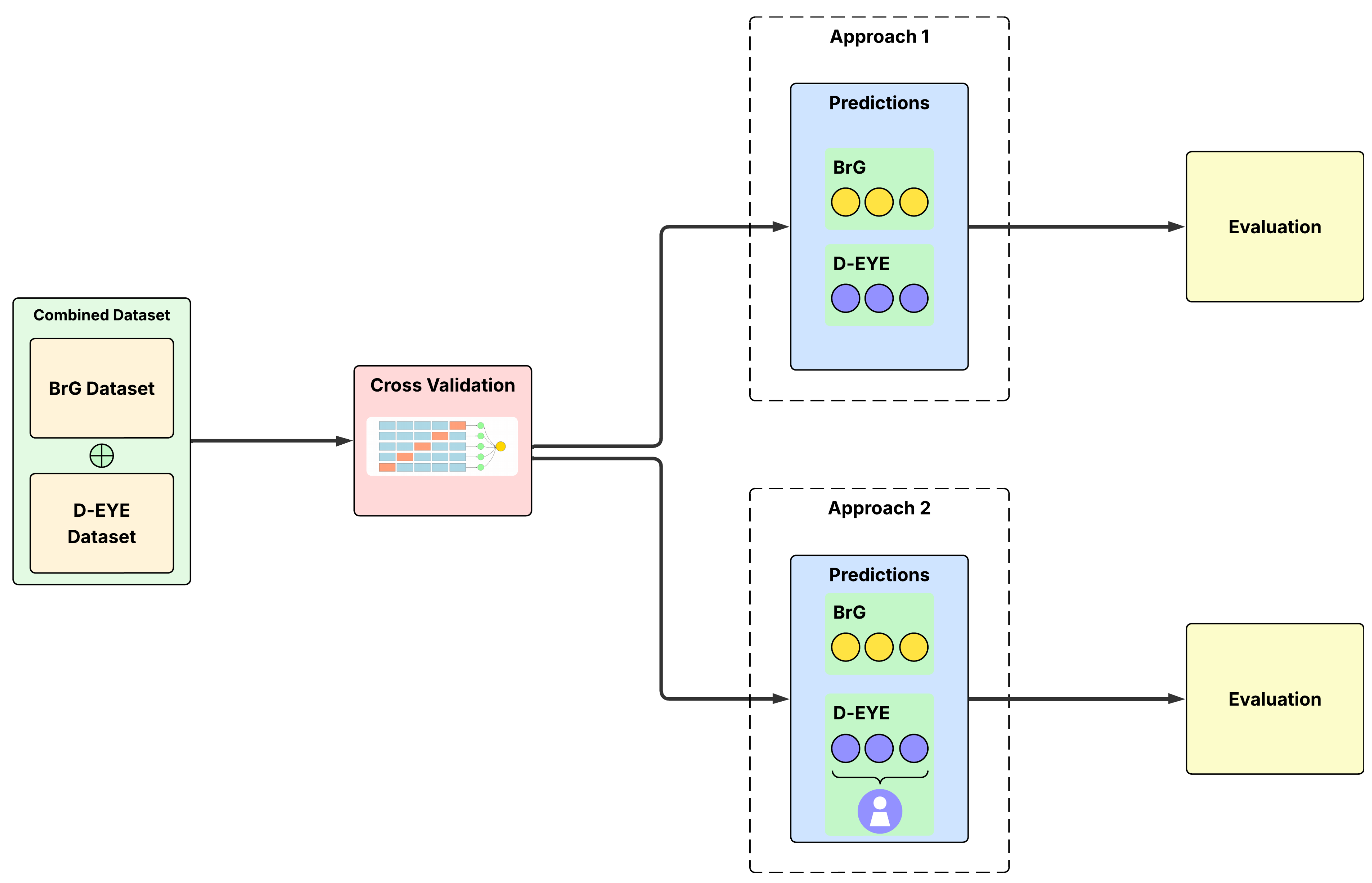 The evaluation of the models was conducted based on the predictions obtained in the validation sets defined during the k-fold cross-validation process. Considering that the training was performed using combined data from the BrG and D-Eye datasets, the performance analysis included both joint evaluation and separate evaluations for each dataset, respecting the specific structure of each dataset. Two distinct evaluation approaches were conducted during the validation stage.