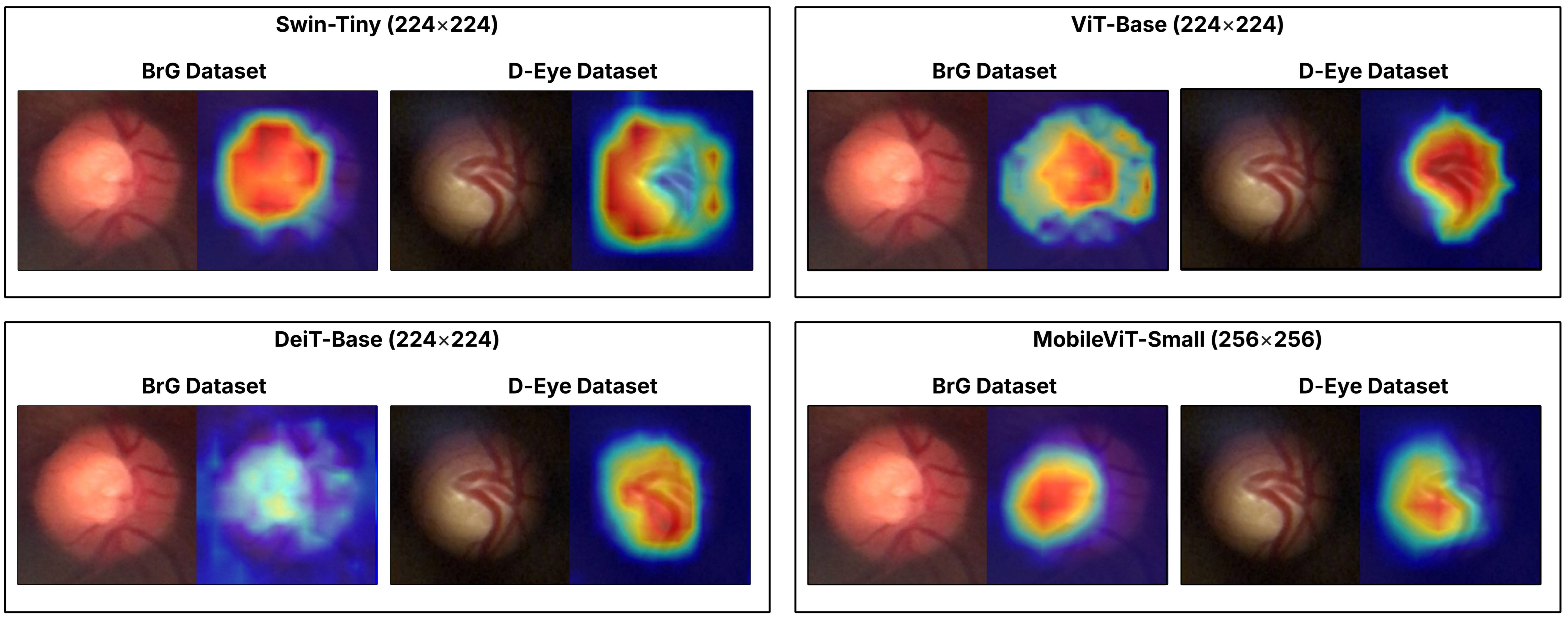 Table 3), we observed that all four models in the BrG dataset achieved high and consistent performance. DeiT-Base stood out a little more, achieving an average accuracy of 92.6%, precision of approximately 93.6%, and recall of 91.6%. These values indicate that it is effective both for identifying patients with glaucoma (high sensitivity) and for recognizing patients without the disease (high specificity of 93.6%). ViT-Base also performed robustly, achieving an accuracy of nearly 91.6% and an F1-score of approximately 91.8%, thereby reinforcing its classification ability in these images with better visual quality.
