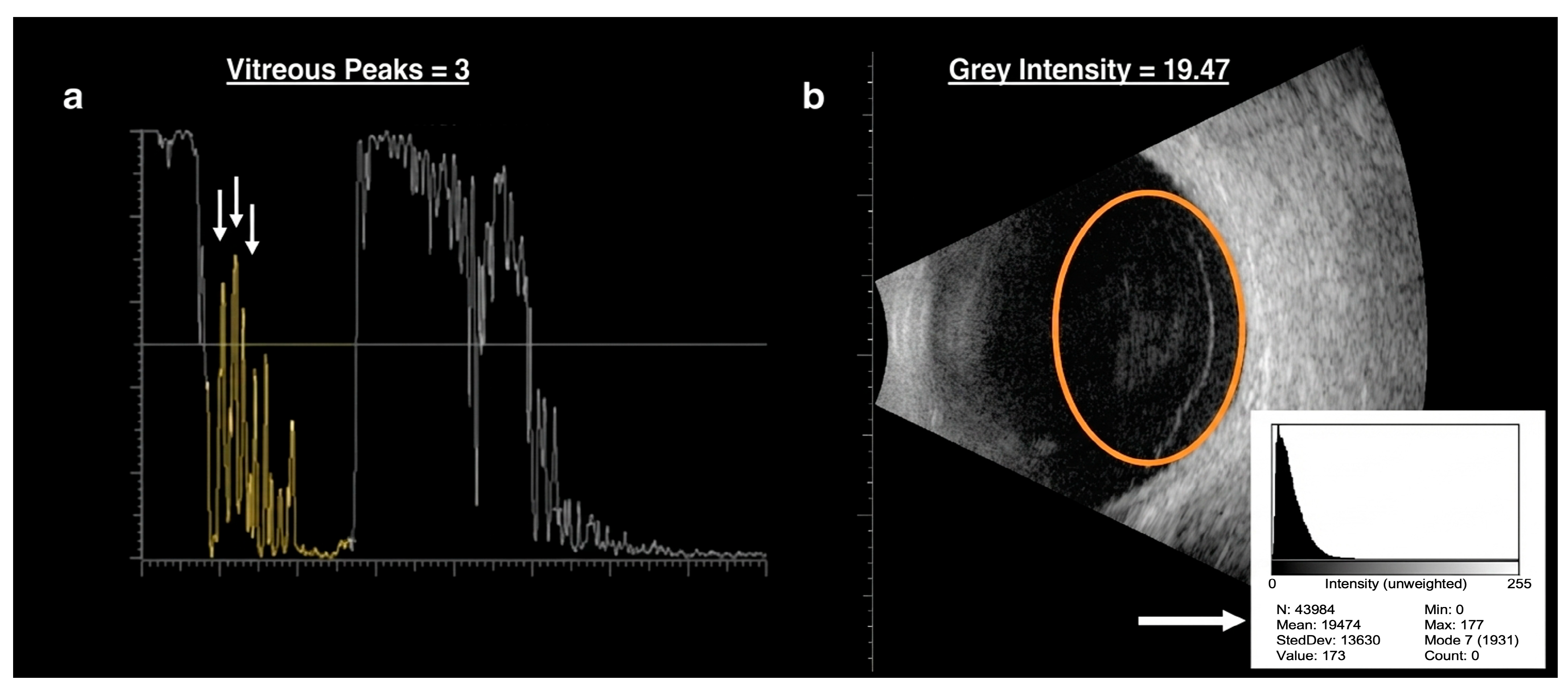 - Salcedo-Villanueva, G.; Trujillo-Alvarez, M.; Becerra-Revollo, C.; Ibarra-Elizalde, E.; Mayorquín-Ruiz, M.; Velez-Montoya, R.; García-Aguirre, G.; Gonzalez-Salinas, R.; Morales-Cantón, V.; Quiroz-Mercado, H.; et al. A Proposed Method to Quantify Vitreous Hemorrhage by Ultrasound. Clin. Ophthalmol. 2019, 13, 2377–2384. [Google Scholar] [CrossRef] [PubMed]