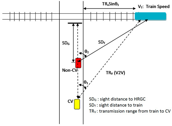 The supply variables for CVs and non-CVs are the transmission range and sight distance at HRGCs. As portrayed in Figure 1, the V2V transmission range is the distance from the approaching train to the CV. The V2V transmission range needs to be projected on the highway for supplying the required stopping distance at active HRGCs. The train speed, V2V transmission range, and sight distance determine the time to collision (TTC) at passive HRGCs. The highway distance is the supply threshold for a safe stop in front of active HRGCs. Train arrival time is the supply threshold at passive HRGCs. Table 1 lists the supply thresholds of CV and non-CVs at active and passive HRGCs.