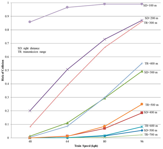 The CV’s risks of collision are calculated based on the transmission ranges from 300 to 700 m. It is observed that when the transmission range is 400 m the risk of collision is close to 0.5 with the train speed of 96 kph (60 mph). If a transmission range of 600 m is provided, then the risk of collision drops to less than 0.1 with the same train speed. Although a transmission range of 700 m can further reduce the risk of collision, the scale of reduction is not large (from 0.08 to 0.02). As observed in Figure 2, the risk of collision for a 600 m transmission range is close to that for a 500 m sight distance with the train speed of 96 kph (60 mph). With the provision of a 600 m transmission range, the risk of collision for the CV is lower than that for the non-CV with a 300 m sight distance to the train.