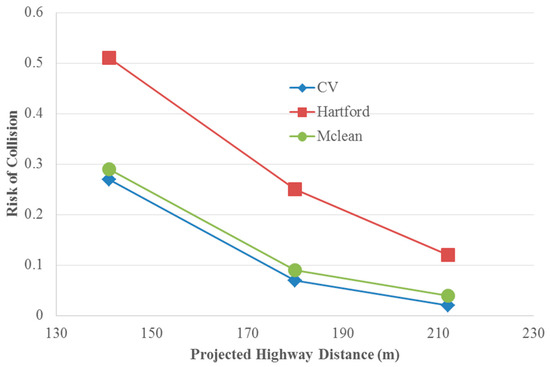 At active HRGCs, the supply thresholds depend on the sight distance to HRGC and transmission range projected on the highway. The demand functions are different for the CV and non-CVs, and three demand functions are used in the calculation of risk of collision. Three supply highway distances (141.4, 176.8, and 212.1 m) are used to compare the risk of collision for the CV and non-CV at active HRGCs as illustrated in Figure 3. The corresponding V2V transmission ranges are 200, 250, and 300 m for each projected highway distance for the CV. The CV’s risk of collision is lower than non-CVs’ at each supply projected highway distance. Given a 300 m transmission range, the CV’s risk of collision is less than 0.1.