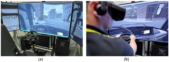 However, a lot of vehicles are currently equipped with various assistance systems. Some of these assistance systems are becoming obligatory according to the new traffic regulations. Training of drivers with these assistance systems represents a crucial concern to automotive manufacturers beside the technical development challenges. This particular concern contributes considerably to the sustainability of the automotive market. Specifically, the human-machine interaction is one of the main aspects related to the customer acceptance. This covers both the physical interface between drivers and assistance systems and the required understanding to operate these systems properly. If drivers are not well trained, these systems may have negative impacts with respect to drivers’ behavior, reaction time, or situation awareness [6]. Problems may arise when drivers feel out of control, if there are many options, or if actions do not lead to the expected results. In addition to the associated safety issues and the lack of regulatory permissions, training of drivers with assistance systems in real traffic environments leads to constraining efforts and costs. Reference [3] provides a low-cost driving simulator that can be used for development and initial training purposes with simple driver assistance systems, such as, e.g., Lane departure warning. In Reference [4], a simulation framework is provided to develop and test more advanced driver assistance systems, such as, emergency brake and steering assistance systems. To address the topic in close cooperation with industry partners and driving schools, the transfer project inTraSim has been carried out at the Heinz Nixdorf Institute in Paderborn, Germany. The main objective of this project was the development of a driving simulator that can be utilized in driving schools to conduct training sessions with driver assistance systems. In addition to the Heinz Nixdorf Institute, the consortium of the project inTraSim consisted of Fahrerakademie Paderborn (modern training center for truck and bus drivers), Aerosoft GmbH (provider of advanced software packages for the realistic simulation of vehicles and airplanes), and VDL Bus & Coach GmbH (manufacturer of buses and chassis modules, Büren, Germany). Figure 2 shows the driving simulator developed within the project inTraSim at the Heinz Nixdorf Institute.