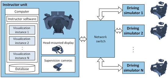 The instructor unit represents the central component within the shown system architecture. This unit includes mainly a computer with a software tool used by the session instructor. In addition to the instructor software tool, there are instances of the visualization software of each of the participating driving simulators installed on the computer of the instructor unit. Through a dedicated local network, each driving simulator sends the position and orientation information of its simulated vehicle and those of the traffic participants to the instructor unit. In addition, the main signals of each simulated vehicle, such as, e.g., steering wheel angle, acceleration and brake pedals, and gear state, are sent to the instructor unit. Specifically, this data is forwarded to the corresponding visualization instances to animate the scenes delivered to the head-mounted display of the instructor. By selecting a particular trainee through the instructor software tool, the instructor can monitor the vehicle signals and switch between different views of the driving scenario. Moreover, a supervision camera is directed to each participating driving simulator. These cameras send video data to the instructor unit, so that the instructor can observe the gaze behavior of any selected trainee. In the presented architecture, the driving simulators are networked to the central instructor unit in a loosely-coupled fashion. That is, the simulation software packages of these driving simulators have no particular knowledge about the internal operation of the instructor software tool. This characteristic adds a major scalability advantage to the training platform. It is convenient to integrate different driving simulators to the training platform, provided that instances of their visualization software are installed on the computer of the instructor unit. Figure 5 shows a prototype of the training platform that was implemented in accordance with the presented system architecture.