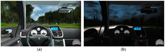 Sample screen shots for the 3D environment: (a) Daytime driving; (b) Nighttime driving.