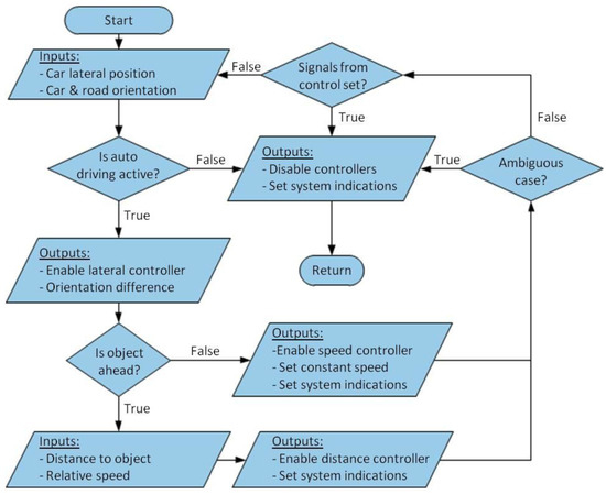 Autonomous vehicles are able to drive themselves as long as the input requirements of their logic are met [14]. When an autonomous driving system reaches the limit of its capabilities, it has to disband or hand over the control to the human driver. Taking full control back from an autonomous system has to be trained for and understood to avoid negative safety effects. A model for an autonomous driving system has been implemented in this work. It is used later as a validation example for the developed training platform. Autonomous driving presents a good example for advanced vehicle systems that drivers must learn before its deployment in real traffic environments. Specifically, it must be clear who is in control at each moment, i.e., the human or the automated driver. A separate sub-routine was implemented within the decision unit of the ADAS simulation model. Figure 8 shows a flow chart for a simplified version of the autonomous driving logic.