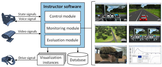 The instructor software tool receives the position and orientation information of the main simulated vehicle and the traffic participants from each participating driving simulator. Moreover, signals regarding the state of the vehicle and the assistance systems are received. In addition, the supervision cameras directed to each driving simulator send video signals to the instructor software. The following sub-sections discuss the concept of each module within the instructor software tool.
