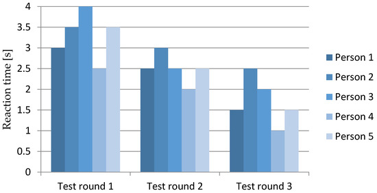In general, there are mainly two approaches when it comes to the validation of interactive driving simulation: physical validation and behavioral validation [15]. The physical validation approach is concerned with parameters related to the simulated vehicle, such as the steering performance of the simulated vehicle in comparison to that of a real vehicle. The behavioral validation approach concentrates on the assessment of reactions and performance of drivers within the virtual traffic scenario. To show the usability and estimate the user acceptance of the developed training platform, this work considers specifically the behavioral validation approach. There are two types of measureable variables in this regard: physiological signs and driving performance [15]. Heart rate, respiration rate, and muscle tension are examples for the physiological signs. The driving performance can be measured, for example, by observing the ability to control the simulated vehicle appropriately or the interaction with other traffic participants [16]. As physiological signs are difficult to measure without dedicated special instruments, the developed training platform is validated by observing the driving performance of test persons [15]. Reaction time is one significant and relevant factor, which can be used to reflect the driving performance, especially when it comes to the utilization of driver assistance systems. The main purpose of the training platform is to introduce advanced vehicle systems to the trainees while not affecting their traffic situation awareness and avoiding eventual capability overestimation. Hence, the utilization of the training platform must lead to a considerable reduction in the reaction time of the trainees in response to the changing states of the advanced vehicle systems during driving. To that end, five test persons were involved in the behavioral validation process using the developed training platform under particular consideration of the reaction time. The group included persons of ages between 25 and 30 years old. While the involved persons did not have prior experience with driving simulators, they have similar experience levels with vehicle driving. In addition to the test persons, an experienced driving instructor was involved to carry out the supervision and instruction roles. The autonomous driving system was introduced to the test drivers. That is, they know in advance about the features of the system and how they should respond to its warnings and indications. The test persons drove in scenarios with destined and random ambiguous driving conditions, where the autonomous driving system gave warning signals and disbanded the control. Each driver had to drive three rounds. The reaction time with which the test drivers took over the control was measured automatically within the simulation model. However, the test drivers were not informed in advance that the reaction time is the main measurement of the experiment. This was particularly necessary in order not to affect the validation process by the awareness of the test drivers. Figure 10 shows the measured reaction times of the five test drivers after the three driving rounds. The measured reaction times have been rounded to the nearest tenth for presentation convenience.