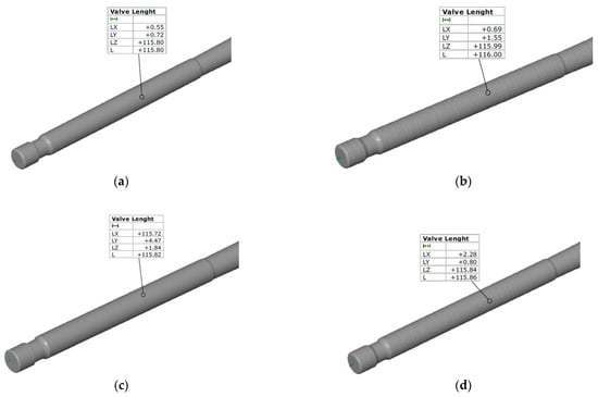 Length measurements of the exhaust valve, performed using four different metrological technologies, demonstrate varied deviations from the nominal value and mutual differences in the interpretation of the object’s geometry. The highest alignment with the nominal dimension was achieved by the contour graph (Figure 11b), which indicated a value of exactly 115.99 mm. However, the model generated by this device exhibits distinct surface roughness on the stem, suggesting that this measurement is susceptible to local material structure. The other three methods yielded results below the nominal value, indicating a negative manufacturing deviation for the valve. The lowest value, 115.80 mm, was recorded for the CMM (Figure 11a). This result, obtained via a tactile method, is considered the most stable reference point, showing a deviation of −0.20 mm relative to the nominal. The laser scanner (Figure 11c) yielded a result very close to the CMM, indicating a length of 115.72 mm, while maintaining the most smoothed visual model of the part. The final method, structured light scanning (Figure 11d), yielded a value of 115.84 mm. The model in this report features a dense mesh structure, which enables precise analysis of the topography of the entire valve surface, but results in a slightly higher length measurement than that obtained with the laser or CMM due to the inclusion of surface micro-irregularities.