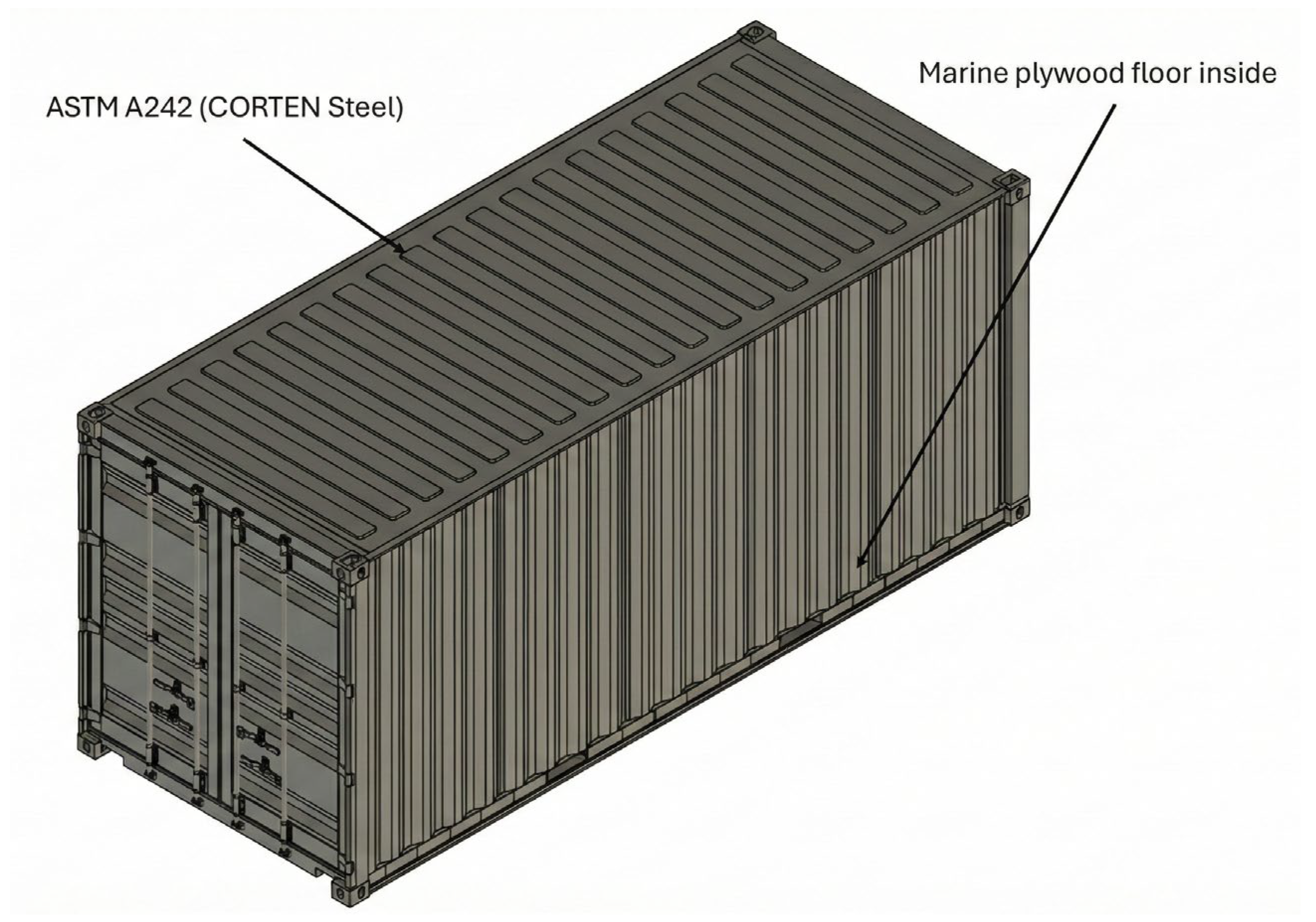 - Container Container. Shipping Container Dimensions. 2019. Available online: https://www.containercontainer.com/shipping-container-%20dimensions/ (accessed on 21 March 2023).