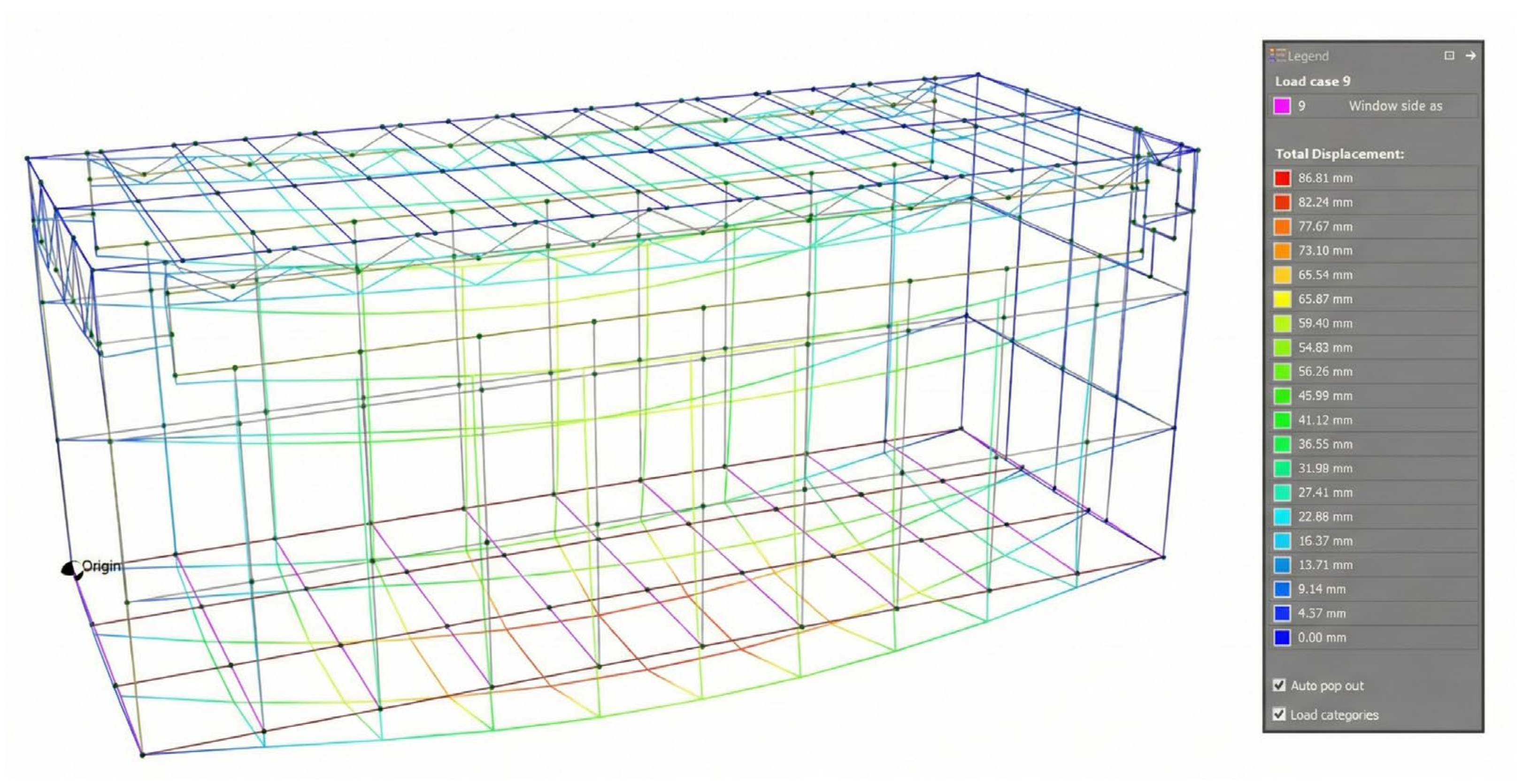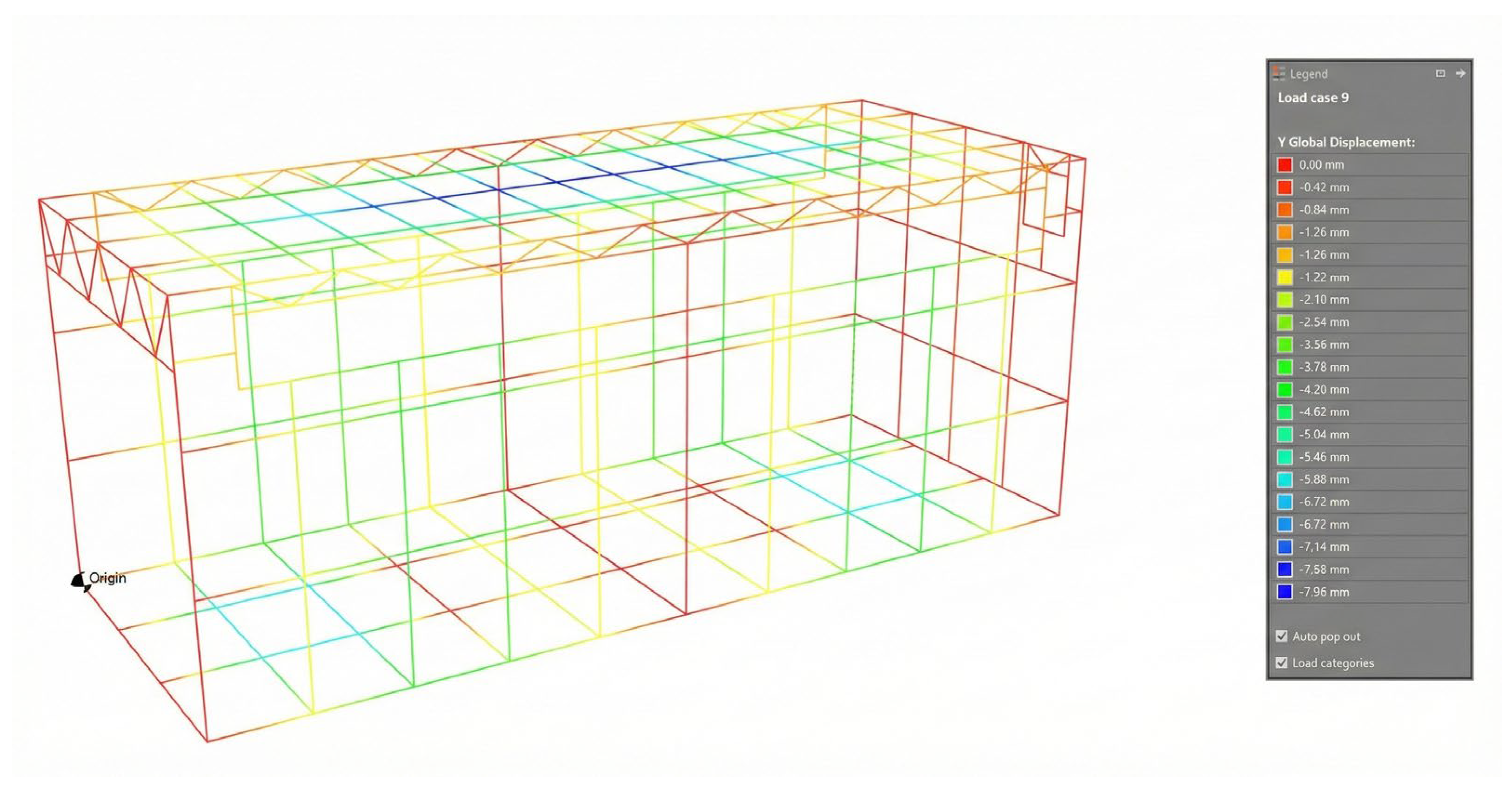 | Note: The analysis confirms the midspan beam was highly effective, reducing the roof’s maximum deflection by 54% and successfully rectifying the initial serviceability failure. While the maximum stress increased, it remained well within allowable material limits. | |||||