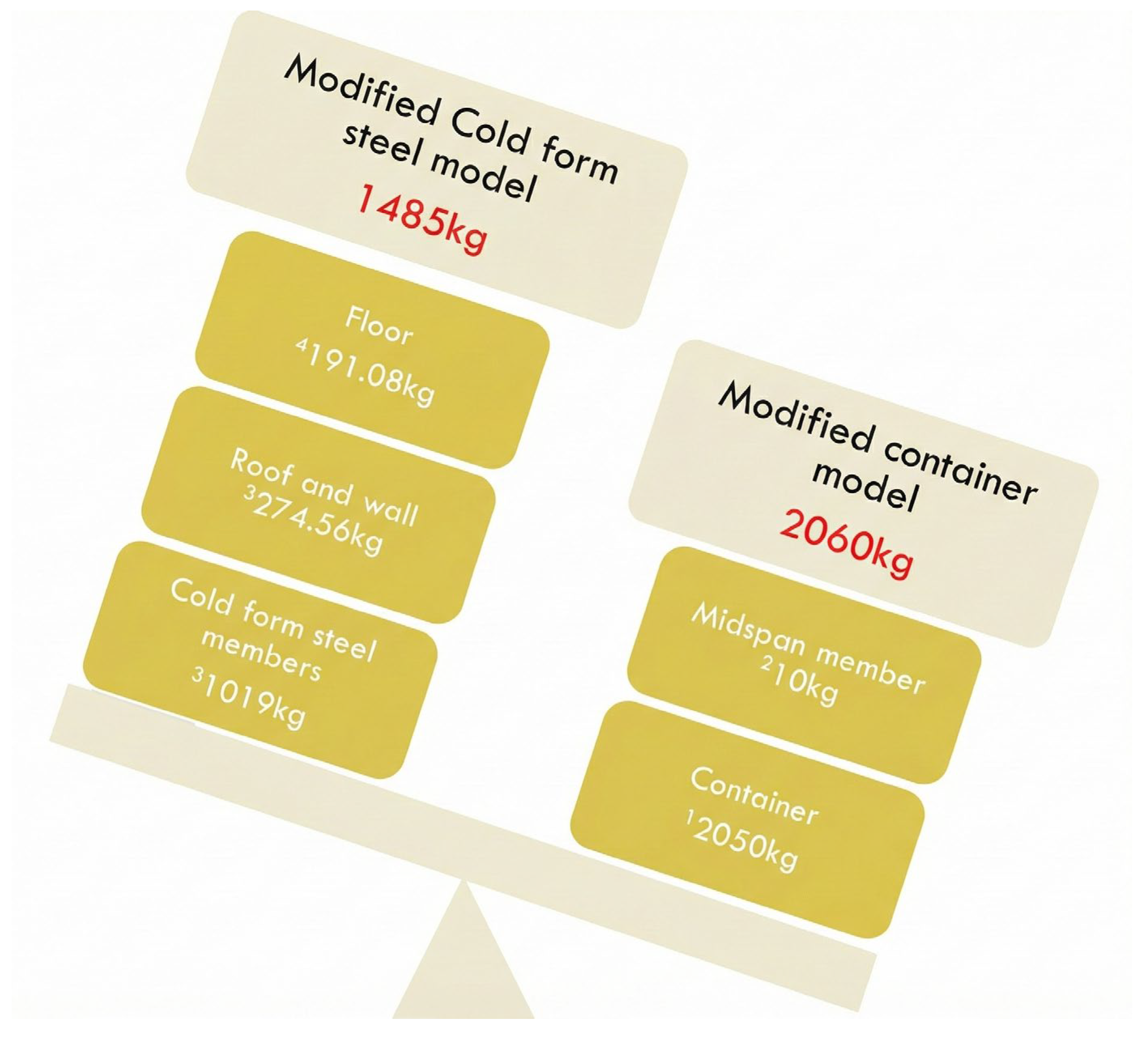| Note 1: The yield stress for the container material (Corten Steel ASTM A242) is 345 MPa. All Von Mises stress values were found to be well within allowable limits. Note 2: The roof failed the serviceability criterion as its maximum deflection of 15.90 mm exceeded the allowable L/500 limit of 12.19 mm by approximately 30%. | |||||