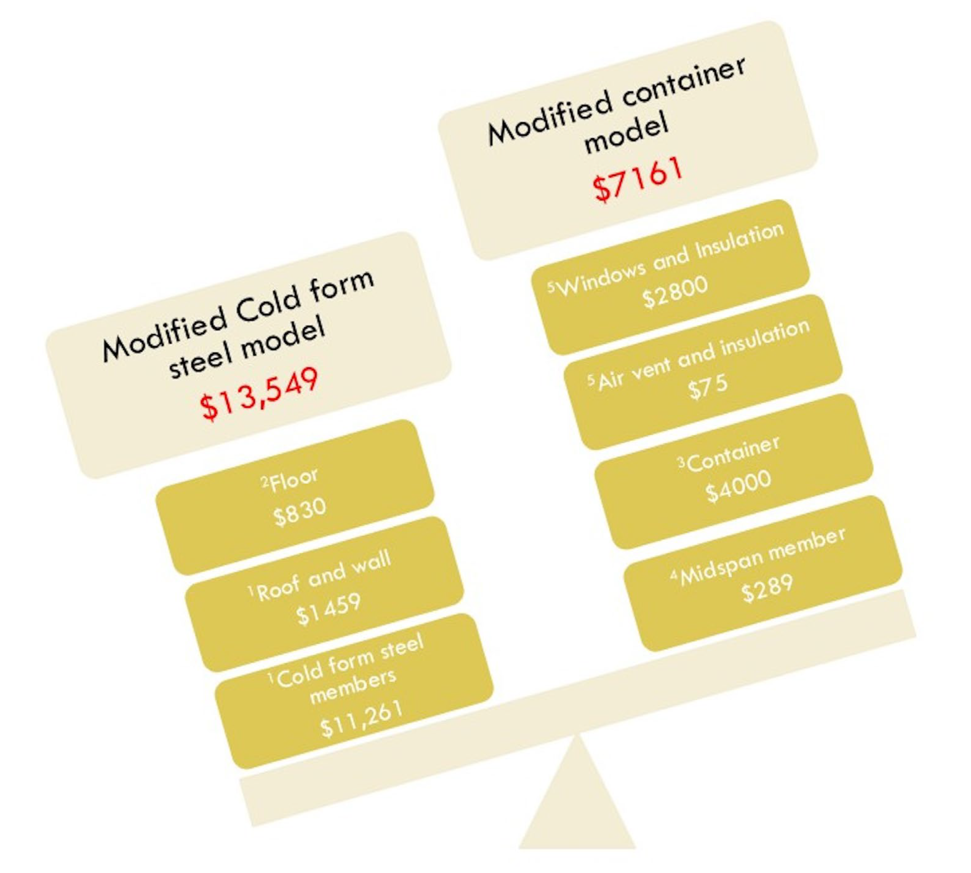 | Note: All costs are material and fabrication estimates based on supplier pricing at the time of research (2023) and are presented in AUD. They do not include costs for labor, transport, foundations, or internal fit-out. Sources: (a) Duncan (2023) [16]; (b) Lump Sculpture Studio (2023) [42]; (c) Ingenious Outdoor Storage Inc. (2023) [43]; (d) Roofing Supermarket (2023) [41]; (e) Trademaster (2023) [40]. | ||||