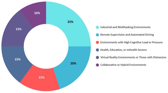 In Figure 6, the most representative work contexts with a high need for ergonomic adaptation in interface design are shown. This distribution identifies the types of work environments or operational conditions that present the greatest challenges for human–machine interaction. The quantitative analysis reveals that multitasking industrial environments and remote supervision scenarios are those requiring UI/UX strategies most urgently centered on visual ergonomics, followed by sensitive sectors such as healthcare, automated transport, and virtual reality.