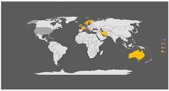 In Figure 7, Germany leads scientific output with nine articles on the impact of UI/UX design in industrial, collaborative, and teleoperation contexts. Italy and Austria follow, each contributing three studies focused on co-design, BIM, and VR environments. The United States contributes two publications centered on space exploration and technical simulations. Finally, seven countries contribute one article each: the United Kingdom, Finland, Norway, Australia, Iran, France, and Sweden. This pattern reflects global interest, with emphasis in Central and Northern Europe, as well as in applications involving automation and virtual reality. Notably, several studies highlight interdisciplinary approaches, integrating fields such as human factors engineering, cognitive psychology, and modeling. The geographic distribution suggests that regions with strong manufacturing and technological sectors are more actively engaging in this research. Moreover, the variety of application domains demonstrates the adaptability of UI/UX principles to both specialized and broad industrial contexts.